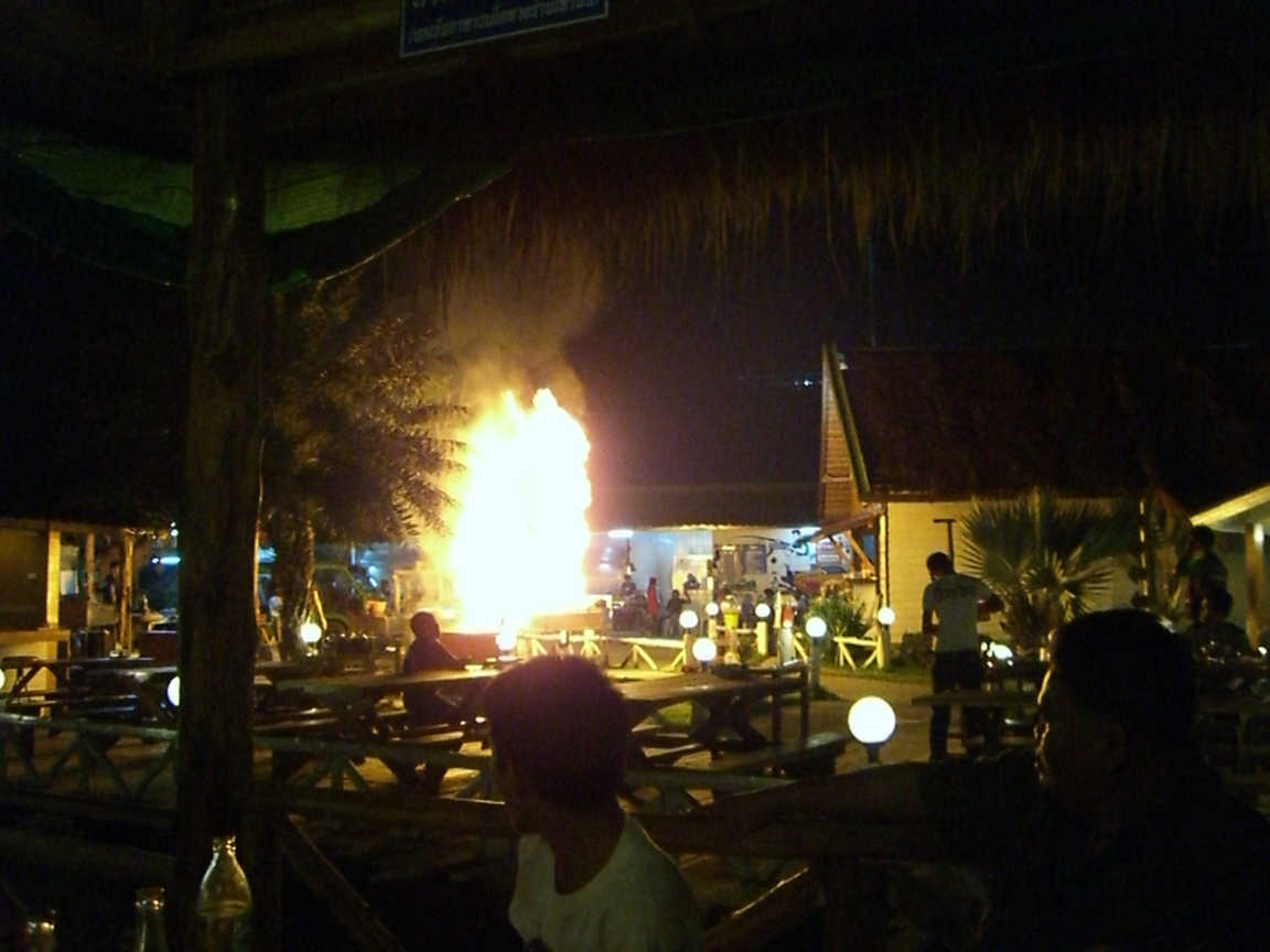 ぽつぽつと点在するレストランの多くは草で屋根を葺き、壁はなく、ガスも使わない。炒め物さえ炭火です。
